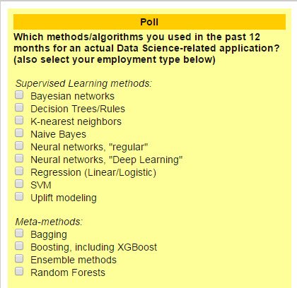 @kdnuggets ongoing: methods/algorithms you used in the past 12 months for#DataScience applications?pic.twitter.com/XFmF0uYyb6