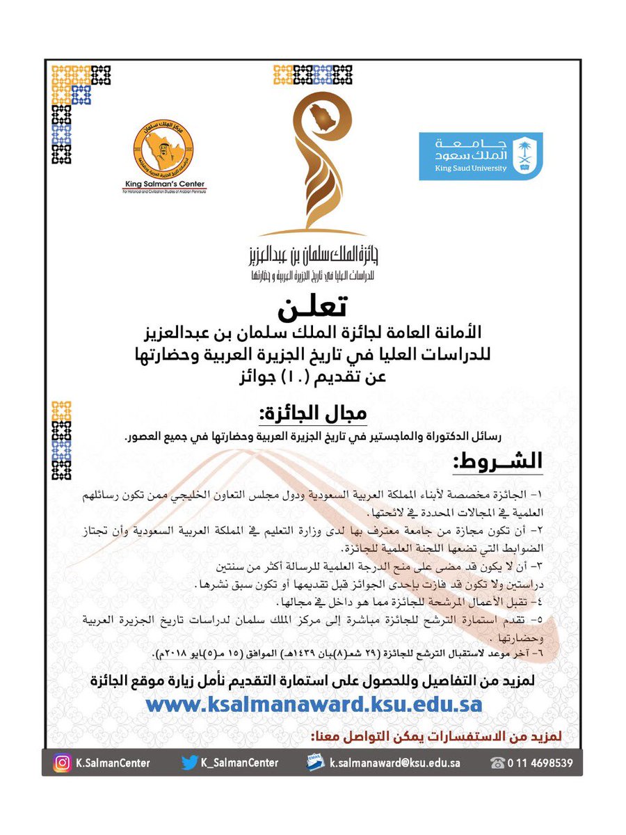 يعلن المركز عن بدء التقدم لجائزة الملك سلمان للدراسات العليا في تاريخ الجزيرة العربية و حضارتها و المخصصة لرسائل الدكتوراه و الماجستير المتميزة للسعوديين و أبناء دول مجلس التعاون الضوابط http://ksalmanaward.ksu.edu.sa/ar/condetion استمارة التقديم http://ksalmanaward.ksu.edu.sa/sites/psalmanaward.ksu.edu.sa/files/attach/stmr_ltqdym_lljyz.pdf …pic.twitter.com/45Va1ssZoO