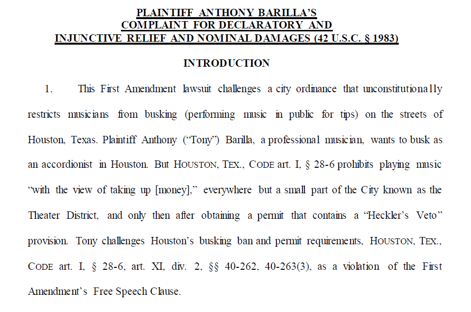 @Anastasia_esq and I filed a#FirstAmendment lawsuit on behalf of Houston-based musician Tony Barilla challenging the city's squeeze on musicians'#freedomofexpression and livelihoods.@PacificLegal#busking#HoustonWeHaveAProblem https://pacificlegal.org/wp-content/uploads/2020/01/Anthony-Barilla-v.-City-of-Houston-Complaint.pdf …Hvala. Twitter će to iskoristiti za poboljšanje vaše vremenske crte. PoništiPoništi -
