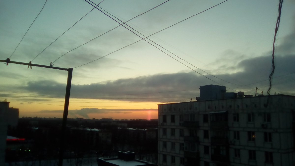 Это закат сегодня над Москвой. Небывалый закатный луч. (Фото прямо с тлф,никакой обработки)pic.twitter.com/qkC2bdY8H2