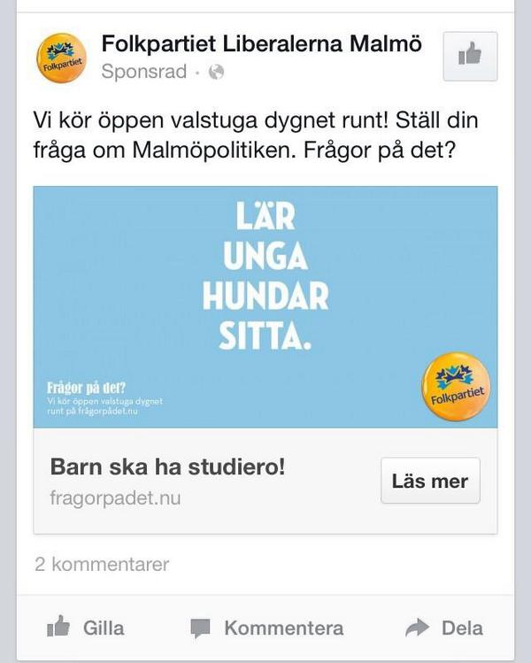 Det här är helt absurt! @fpmalmo kallar barn och unga för "hundar" som måste "lära sig att sitta"pic.twitter.com/5WhhNLnbqO