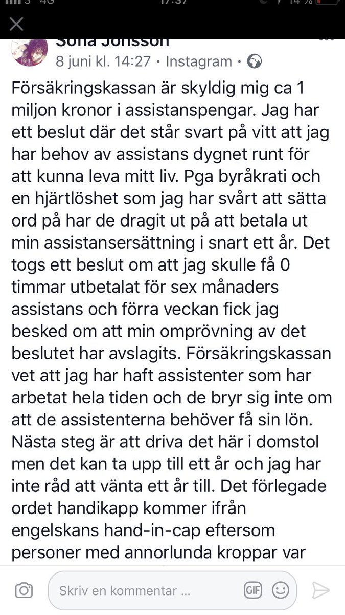 Min vän har nekats assistans, den assistans hon tidigare haft. Nu är hon instängd i sin lägenhet, i sin egna kropp. Önskar du skulle träffa henne! Snälla gör det, så här får det inte gå till!