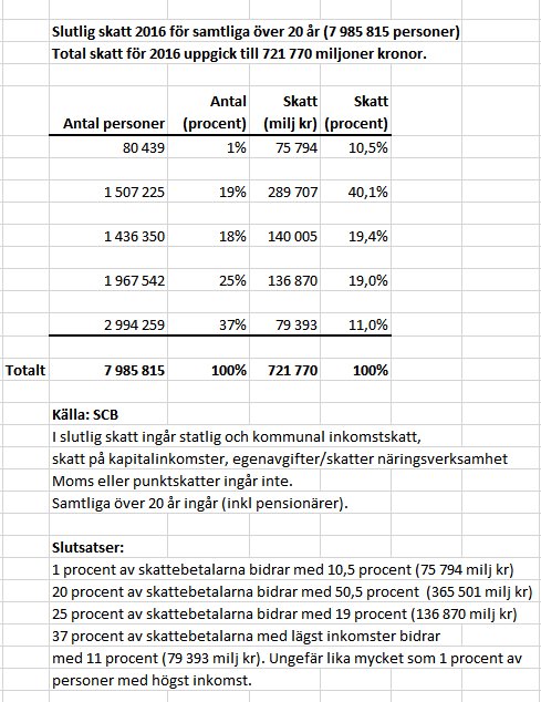 Vart går gränsen? Statistik från SCB för 2016 visar hur vi bidrar till våra skatter. Den visar att 1 procent av de som tjänar mest bidrar med lika mycket som 37 procent av de som tjänar minst. Inte tillräckligt? (Även inom arbgivavg. sker en omfördelning.).pic.twitter.com/TXngKs2ehJ