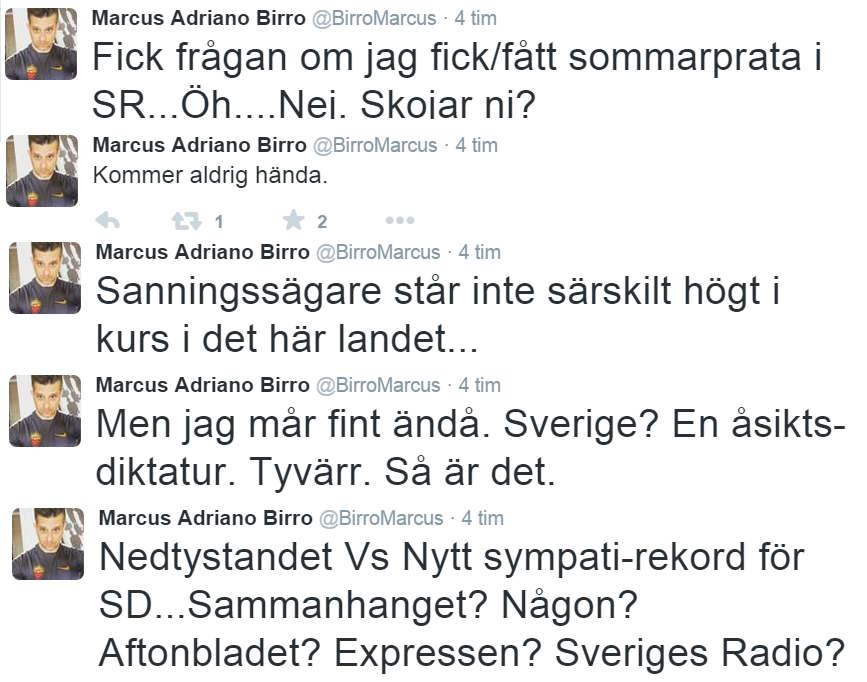 Marcus Birro fick inte sommarprata, därför ökar SD och Sverige är en åsiktsdiktatur. #slipperyslopepic.twitter.com/wXCUkevOlf