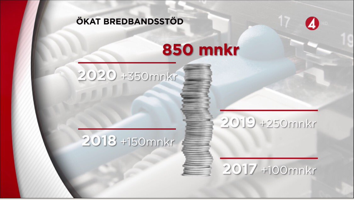 Regeringen satsar ytterligare 850 miljoner under 2017-2020 på stöd till utbyggnad av bredband. Ur Nyheterna kl 19.pic.twitter.com/p5GbpPkRzb