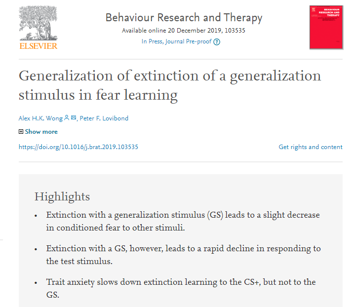 My paper with Peter Lovibond is now accepted in BRAT! We examined how effectively extinction learning to a generalization stimulus generalizes to other stimuli, and whether trait anxiety modulates the generalization of extinction learning. https://doi.org/10.1016/j.brat.2019.103535 …pic.twitter.com/DIMBjJCoB5