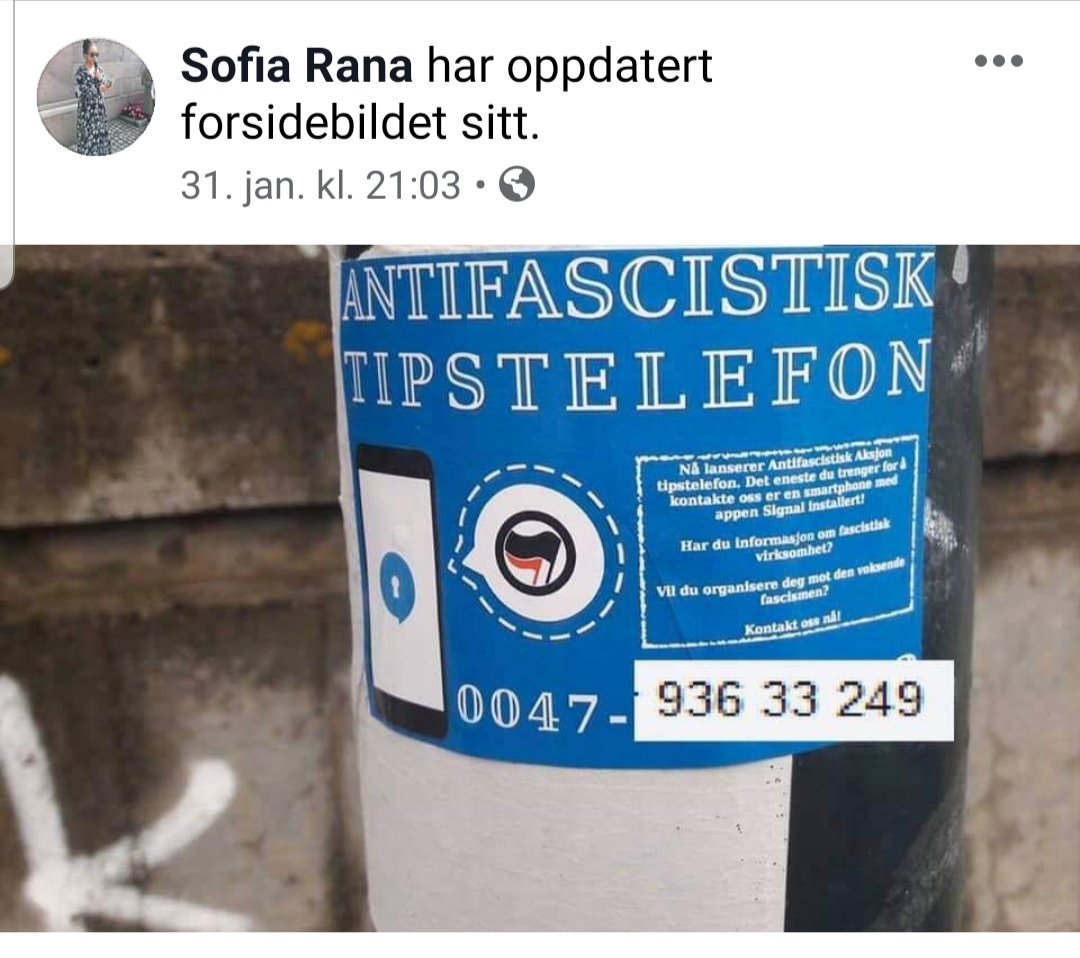 Sofia Rana tillitsvalgt i Frifagforening og representant for partiet @rødt oppfordrer sine følgere til å kontakte Antifa ,hvis de ser noen meningsmotstandere. Bekymringsfullt . Vi alle vet og har følt på kroppen hva Antifa er kapable til .