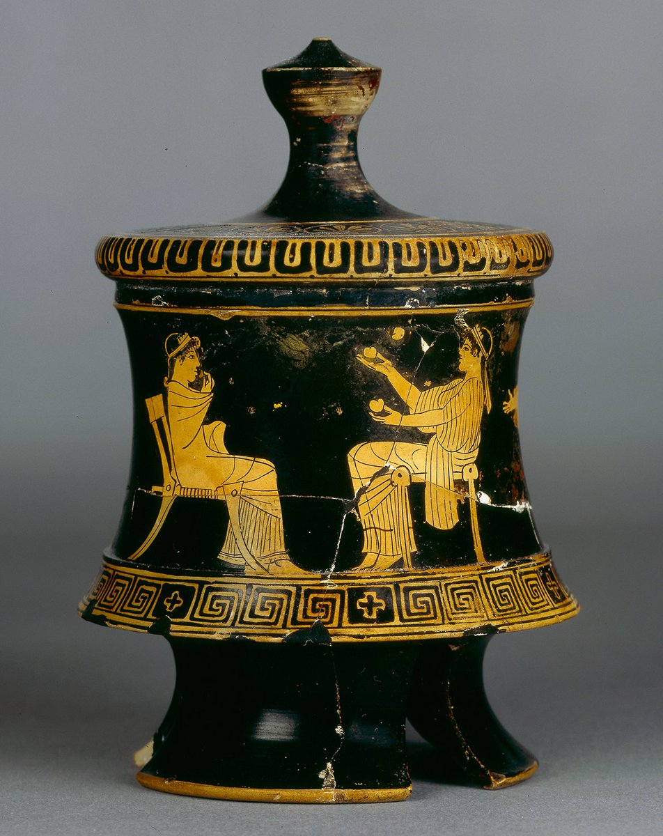 Athenian red-figure pyxis with two girls at play - one appears to be juggling some fruit! 500-401 BC