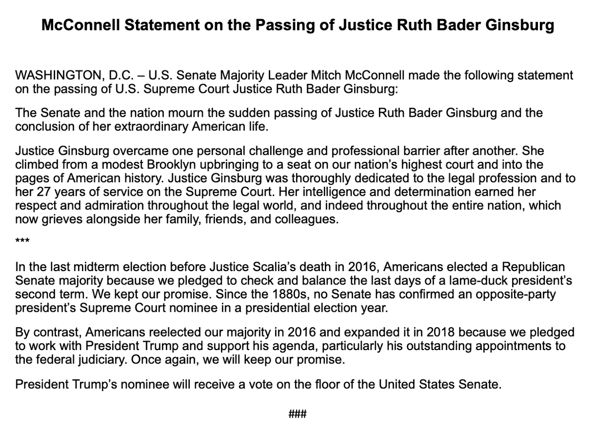 Updates TK, w/ @BresPolitico @marianne_levine @kyledcheneyhttps://www.politico.com/news/2020/09/18/mcconnell-vows-senate-will-hold-vote-on-ginsburgs-replacement-418021 …