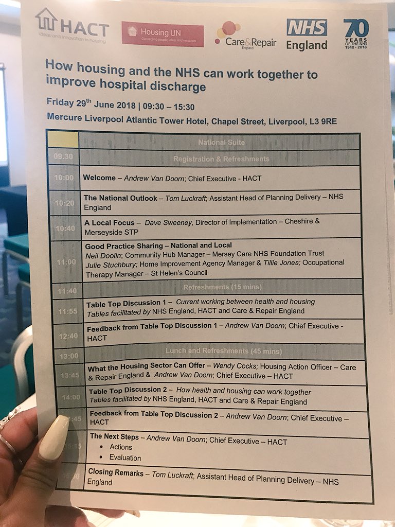 @cr_england is talking#health and#housing working together to improve hospital discharge with@AndrewvanDoorn at the@NHSHosp_to_Home event in Liverpool today@HousingLINews@HACThousingBedankt, Twitter gebruikt dit om je tijdlijn te verbeteren. Ongedaan makenOngedaan maken -