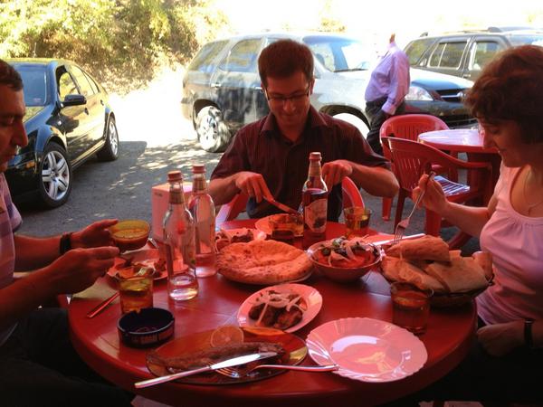 Wybory w Gruzji: nasz zespół je obiad w rejonie Borjomi:-) Zaraz ruszamy dalej, do kolejnej komisji wyborczej.pic.twitter.com/GqYlG8Bt