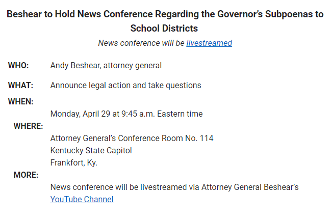 @AndyBeshearKY has announced a press conference for Mon morning to announce legal action re: the Labor Cabinet's subpoenas for records of teachers who called in sick to protest at the legislature#sickoutpic.twitter.com/8GE5K14XEI