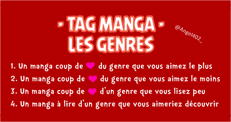 ▶️TAG MANGA N°3 : LES GENRES 🔴Attention ! Genre =/= shojo, shonen, seinen, etc... Citez pour répondre. N'oubliez pas d'utiliser le hashtag #TagManga pour que tout le monde puisse retrouver vos réponses. N'hésitez pas non plus à taguer d'autres personnes !pic.twitter.com/bAIyfWVugA
