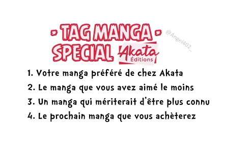 ▶️TAG MANGA N°6 : SPÉCIAL @AKATAmanga Citez pour répondre. 🔴Tout les mangas cités doivent être publiés chez Akata ! N'oubliez pas d'utiliser le hashtag #TagManga6 pour que tout le monde puisse retrouver vos réponses. N'hésitez pas non plus à taguer d'autres personnes !pic.twitter.com/bGWom8BJ4u