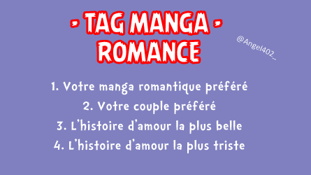 ▶️TAG MANGA N°5 : ROMANCE Citez pour répondre. N'oubliez pas d'utiliser le hashtag #TagManga5 pour que tout le monde puisse retrouver vos réponses. N'hésitez pas non plus à taguer d'autres personnes !pic.twitter.com/3U8S6t96hg