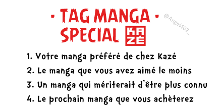 ▶️TAG MANGA N°10 : SPÉCIAL @KazeFrance Citez pour répondre. 🔴Tout les mangas cités doivent être publiés chez Kazé ! N'oubliez pas d'utiliser le hashtag #TagManga10 pour que tout le monde puisse retrouver vos réponses. N'hésitez pas non plus à taguer d'autres personnes ! pic.twitter.com/lk3Bi544iE