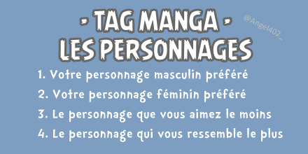 ▶️TAG MANGA N°11 : LES PERSONNAGES Citez pour répondre. N'oubliez pas d'utiliser le hashtag #TagManga11 pour que tout le monde puisse retrouver vos réponses. N'hésitez pas à taguer d'autres personnes !pic.twitter.com/UuTD0L3nlQ