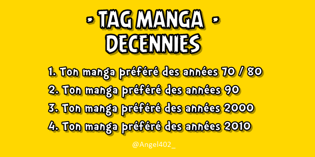 ▶️TAG MANGA N°13 : DÉCENNIES Citez pour répondre. N'oubliez pas d'utiliser le hashtag #TagManga13 pour que tout le monde puisse retrouver vos réponses. N'hésitez pas à taguer d'autres personnes !pic.twitter.com/GJXCcbQAQl