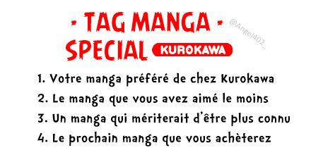 ▶️TAG MANGA N°12 : SPÉCIAL @Kurokawa Citez pour répondre. 🔴Tout les mangas cités doivent être publiés chez Kurokawa ! N'oubliez pas d'utiliser le hashtag #TagManga12 pour que tout le monde puisse retrouver vos réponses. N'hésitez pas non plus à taguer d'autres personnes !pic.twitter.com/rhKxCL3LZI