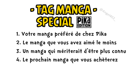 ▶️TAG MANGA N°14 : SPÉCIAL @pikaedition Citez pour répondre. 🔴Tout les mangas cités doivent être publiés chez Pika ! N'oubliez pas d'utiliser le hashtag #TagManga14 pour que tout le monde puisse retrouver vos réponses. N'hésitez pas non plus à taguer d'autres personnes !pic.twitter.com/NJxUHOOxYs