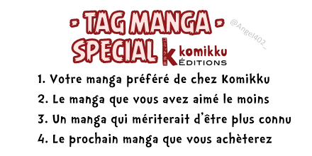 ▶️TAG MANGA N°16 : SPÉCIAL @komikku Citez pour répondre. 🔴Tout les mangas cités doivent être publiés chez Komikku ! N'oubliez pas d'utiliser le hashtag #TagManga16 pour que tout le monde puisse retrouver vos réponses. N'hésitez pas non plus à taguer d'autres personnes !pic.twitter.com/uyAWE6XAdc
