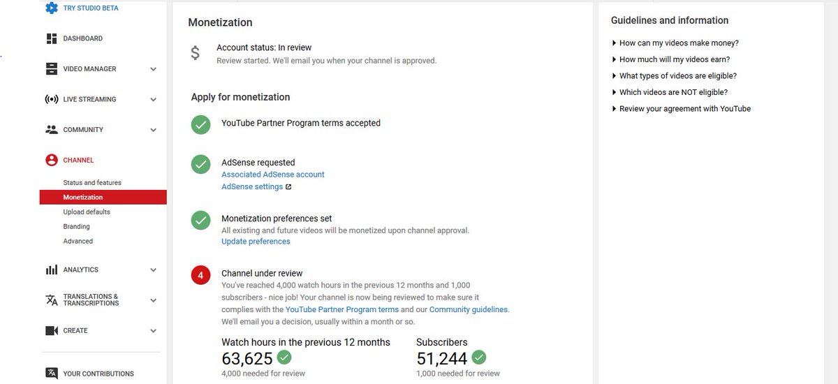 @TeamYouTube i have reached 1,000 Subscriber and 4,000 Watch hours Last 365 days but monetization still under review last more 100days please you tube team my channel review and enable monetization Channel Url: https://www.youtube.com/channel/UCwG50wlW1R9m5eNiIr7aupA …pic.twitter.com/jx9znDZ9QP