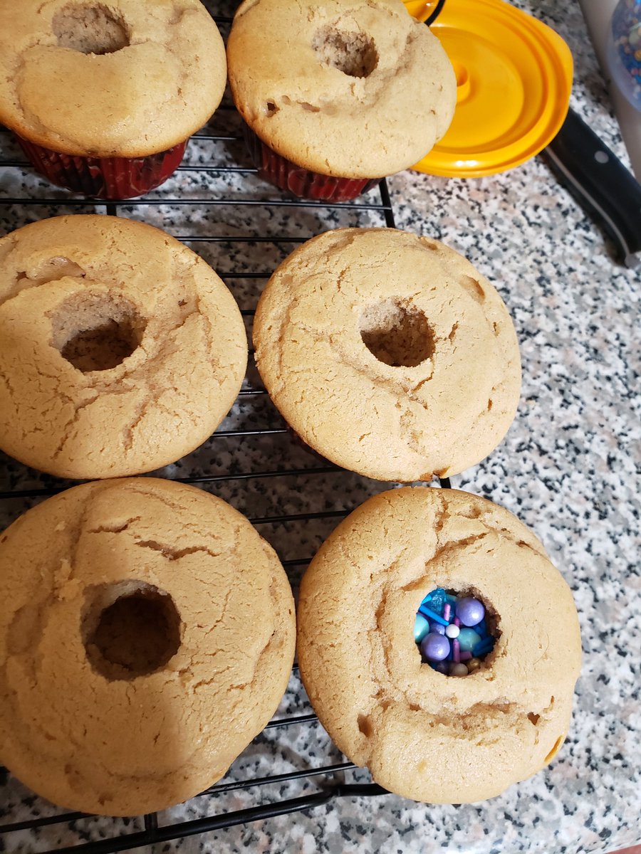 Peanut butter cupcakes with surprise sprinkle middle and chocolate buttercream icingpic.twitter.com/soCC84aTx1