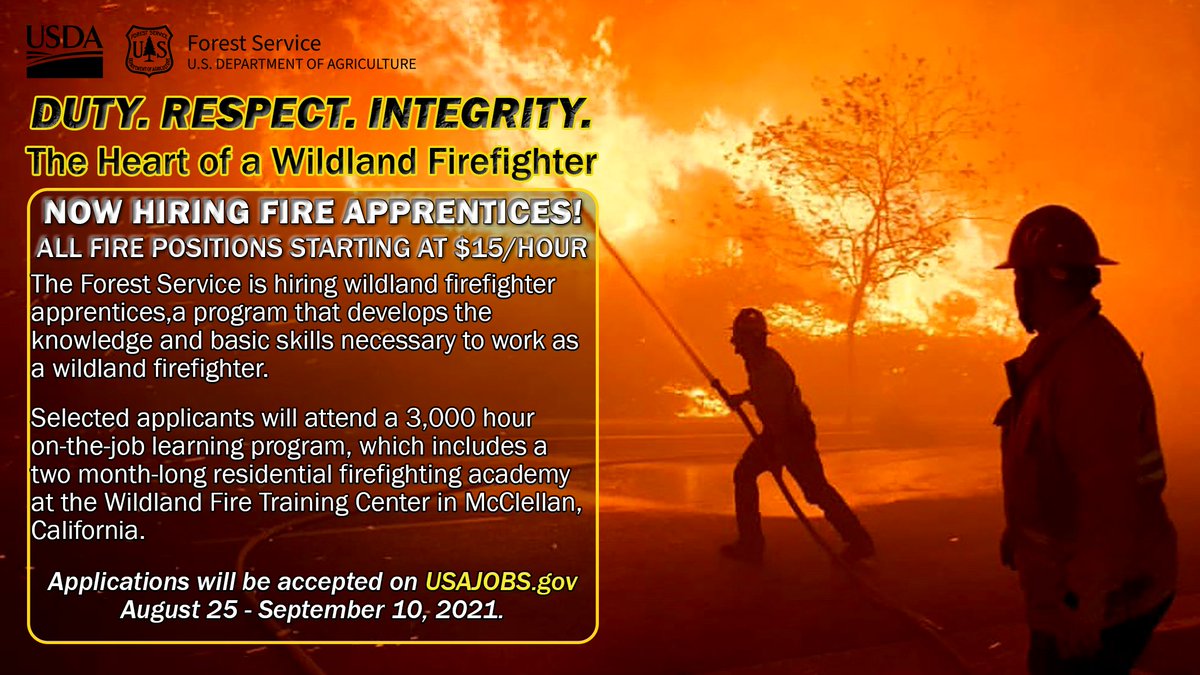 The Forest Service is hiring for the Wildland Fire Apprentice Program, which develops the knowledge and basic skills necessary to work as a wildland firefighter. The following positions will be open on http://www.usajobs.gov Aug. 25-Sept. 10. More below.pic.twitter.com/psp9yjUz6B