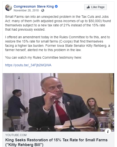Congressman Steve King of Iowa was a huge proponent of the tax laws... even though small farms had a huge tax increase. He promotes it as an "accident" that small farms with low incomes lost their tax expenditure... but it wasn't.pic.twitter.com/1czKhpQilM