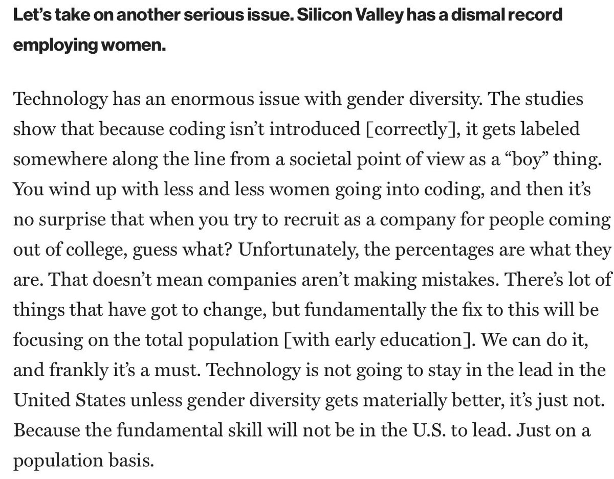Checking in with the world's #1 company by market cap. Only $285 billion dollars of cash on hand, only 40 countries have GDP higher than that. "Technology is not going to stay in the lead in the United States unless gender diversity gets materially better, it’s just not." -CEO pic.twitter.com/uDicISfnms