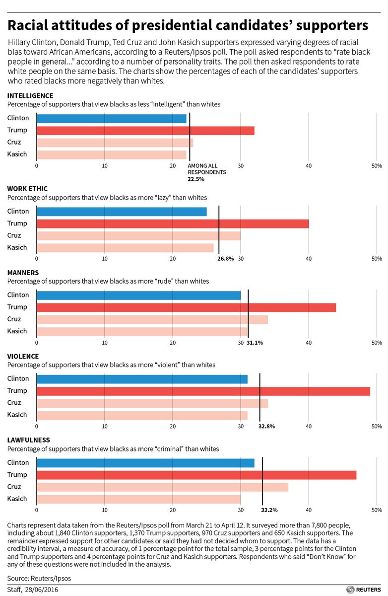 H: "Only 23% of my supporters consider blacks less intelligent, contrasted with 33% of Trump's vile racists."