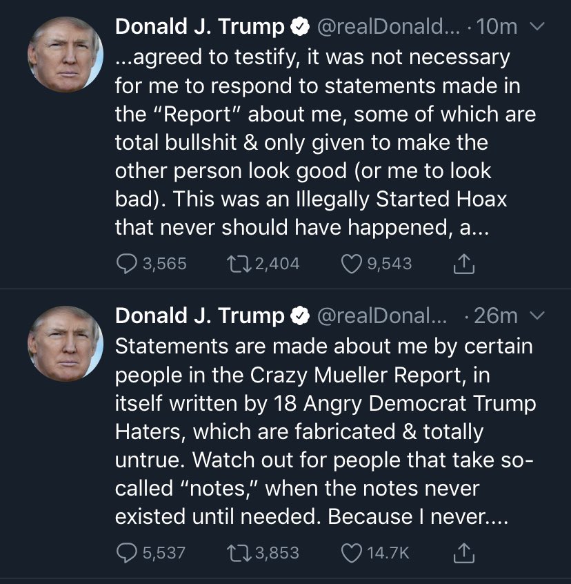 That bottom Tweet isn’t even English. I do thoroughly enjoy the switch from “TOTAL EXONERATION” to “Crazy Mueller Report” though.pic.twitter.com/jGlpAV5mZ3