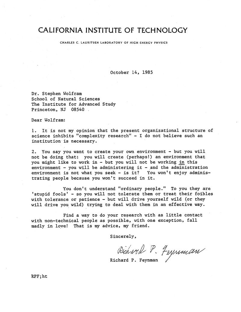 Interesting story from the interwebs. 26yo Stephen Wolfram was unhappy at being treated badly at the IAS. He wanted to start his own institute to continue his research and asked his ex-colleague, Feynman, for advice. Feynman’s reply: pic.twitter.com/vtFBFxOTsJ