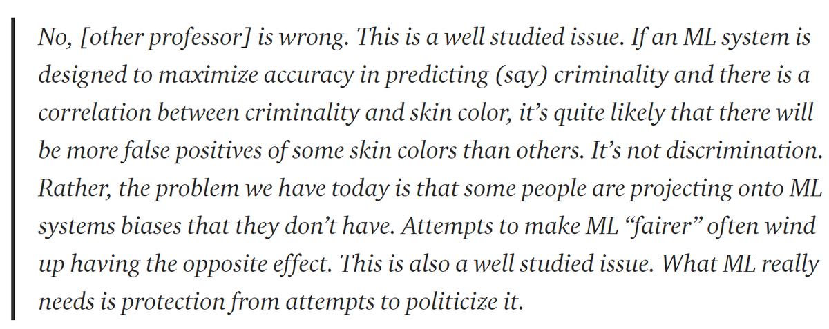 He's also ignorant. E.g. he suggested that differences in model performance for different skin color must be based on the truth of the data, not algorithmic bias. But research shows that's not true at all. https://www.technologyreview.com/2020/06/12/1003482/amazon-stopped-selling-police-face-recognition-fight/ …pic.twitter.com/MX2BUM3g9c