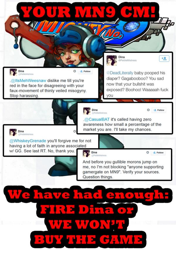 DO NOT BUY @MightyNo9 til @PetiteMistress is fired or apologizes. But I wouldn't expect professionalism. #GamerGatepic.twitter.com/xDhnS260xv