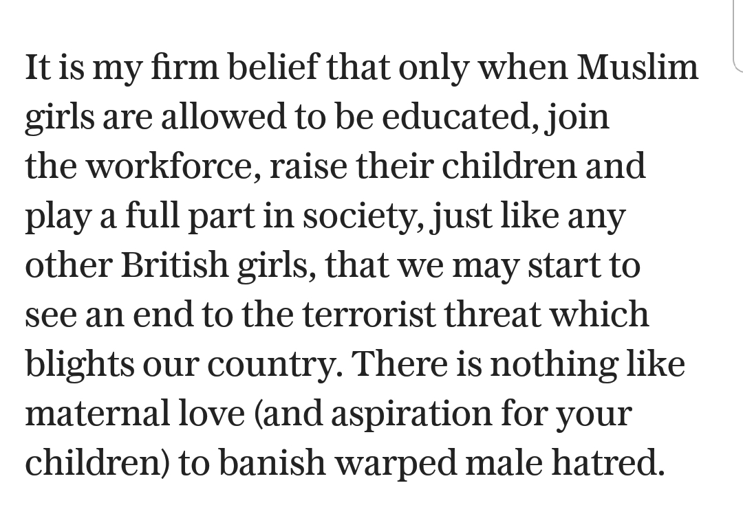 @Telegraph "only when Muslim girls are *allowed* to be educated..we may..see an end to the terrorist threat" Reality: 25% of Muslim women aged 21-24 have degrees, vs. 22% of Muslim men of the same age Islamophobic bigotry has poisoned her mindpic.twitter.com/TU0WtXoHJ3