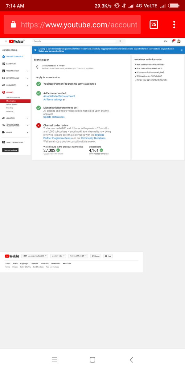 Hello @TeamYouTube My channel is completed the 4K+ hours watch time & 1K+ subscribers in previous 12 Months and still my channel monetization is not enabled plz guide us. Channel link :-https://www.youtube.com/channel/UCM8rK2gIhJK99x56hqsdRIw … Thank you.pic.twitter.com/rddrZ5FbwN