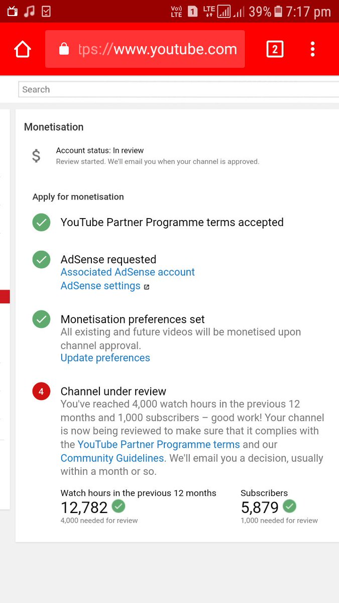 @TeamYouTube Hello Team youtube my channel cross 5k+ subscribers and 12000 hrs watchtime but monetization not enabled.Please review my channel as soon as possible Channel Link : https://m.youtube.com/channel/UCXQr0wraQxHAowtAtEifJFA … Thankspic.twitter.com/JGuIQn6jID
