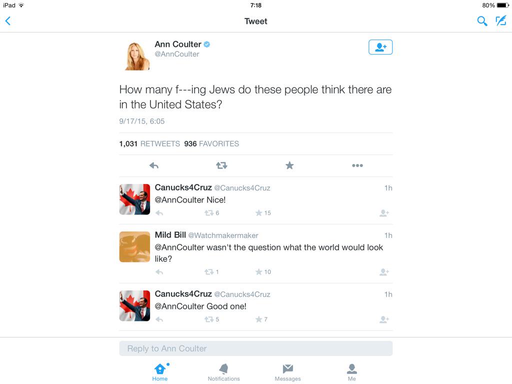 @AnnCoulter How many f---ing Jews ..." OK, just to be fair, if Ann comes on the Hustle, I'll let her shave MY legs for ME.#QuidQuoPro - Show more
