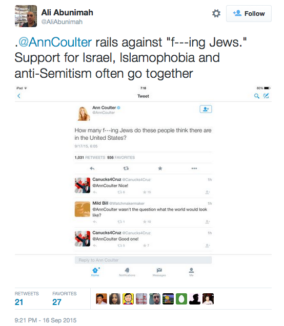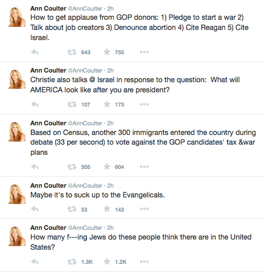 @AnnCoulter rails against "f---ing Jews." Support for Israel, Islamophobia and anti-Semitism often go togetherpic.twitter.com/6rxVLxo7f5