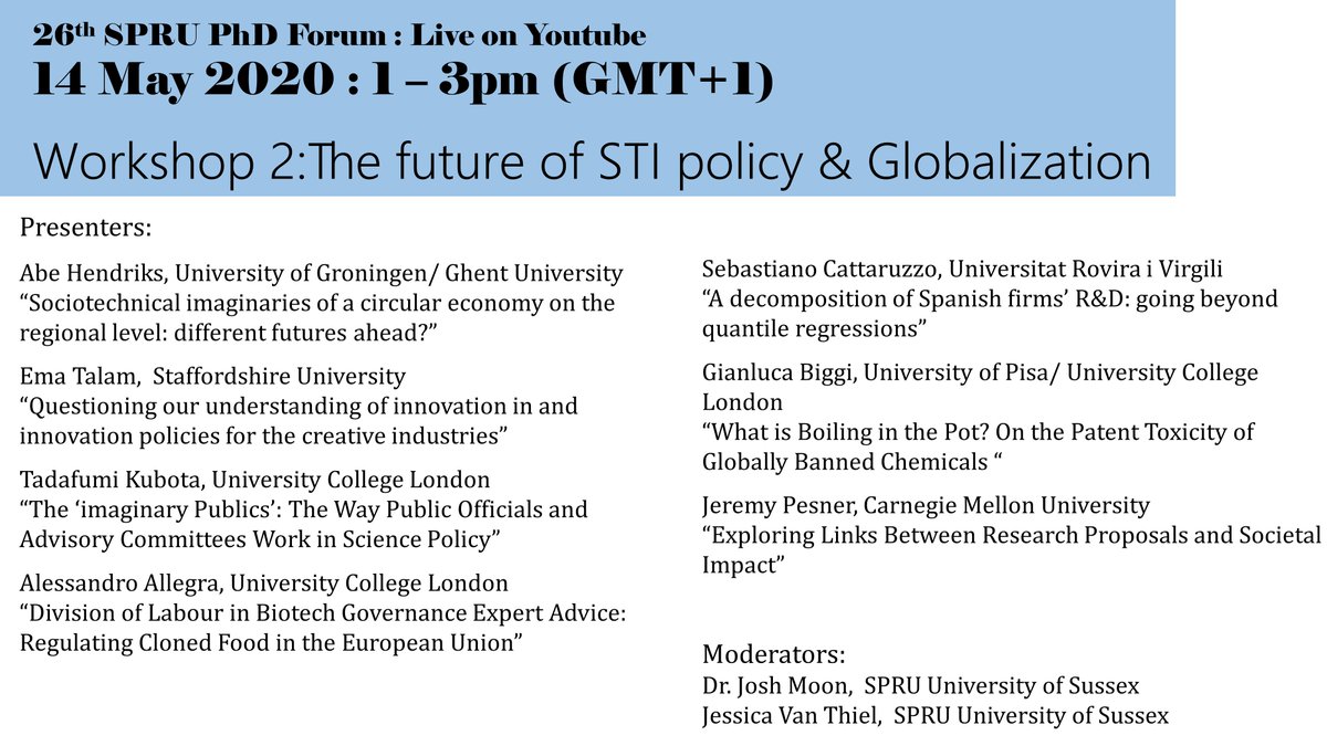 Workshop Two 'The Future of Science Tech Innovation/Globalisation' is coming up at 1pm(UK)today. Seven PhD presentations moderated by @DrJRMoon and Jessica @pathfindersocen pic.twitter.com/JpjVVMV7pL