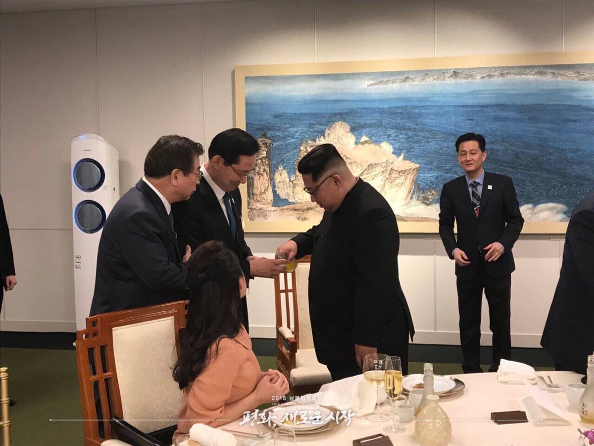 The North Korean leader Kim Jong Un is poring a glass of liquor to Korean defence minister, Song Young-moo, and to the director of information agency (a GCHQ equivalent in Korea), Suh Hoon.pic.twitter.com/ioSe8qPljq