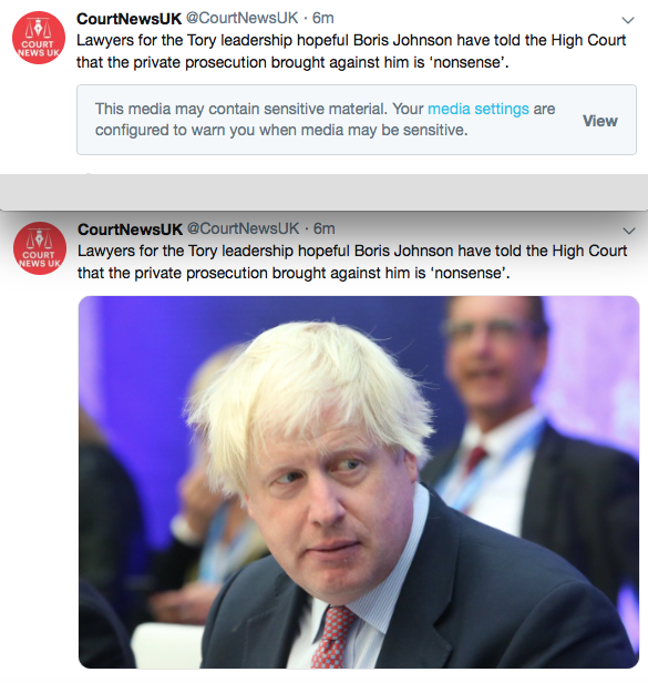 Twitter has decided I'm sensitive to pics of Boris Johnson 😂😂😂 (Twitter have NO problem openly showing me abuse/stalking/defamation/sexual harassment/gore/racist/disability hate, tweets) But pics of politicians come with a warning 🙈😂pic.twitter.com/rEm9CifWJz