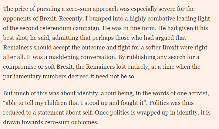 By refusing to consolidate around any form of Brexit and rubbishing even the softest Brexit model, the People's Vote campaign lost the remain cause utterly: My FT col on zero-sum politics. https://www.ft.com/content/775189fa-40ea-11ea-bdb5-169ba7be433d …pic.twitter.com/d1B8JzUu4h