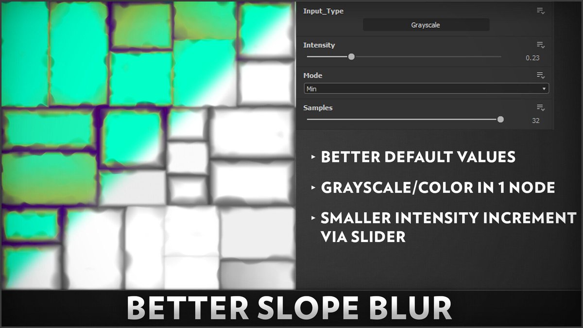 Hot off the press, I've published 'Better Slope Blur' for #SubstanceDesigner . This simple node defaults to much better values for slope blur, combines grayscale/color into 1 node, and uses smaller increments on the slider for much easier tweaking https://artstn.co/m/NNVgW pic.twitter.com/U0pcy6Ncja