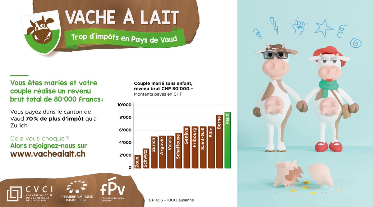 Réagissons! Dans le canton de Vaud, un couple marié gagnant 80'000 fr. paye 70% de plus d’impôt qu’à Zurich! Rdv sur http://www.vachealait.ch - et pour plus de détails: http://www.vachealait.ch/nos-parutions/impots-couple-marie/ …