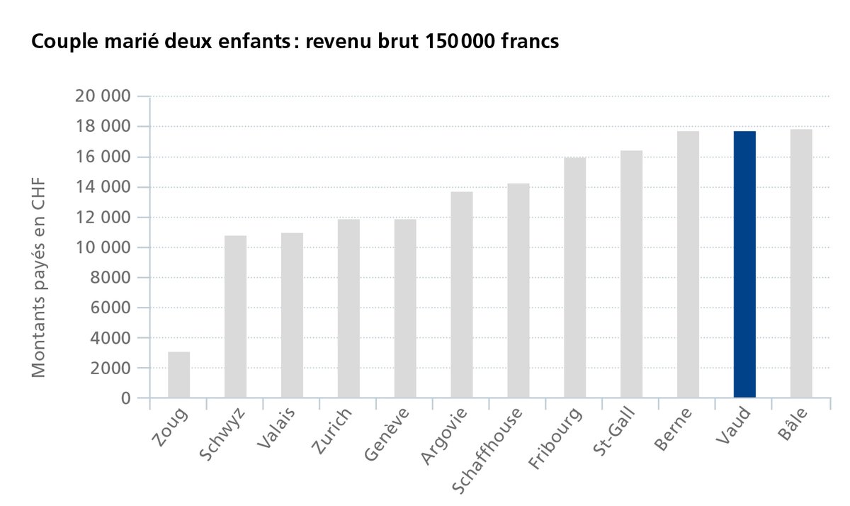 Vous êtes mariés avec 2 enfants? Pour un revenu de 150'000 fr. par exemple, vous payez un tiers de plus d’impôt qu’à Zurich! D'autres comparatifs choquants sur http://www.vachealait.ch