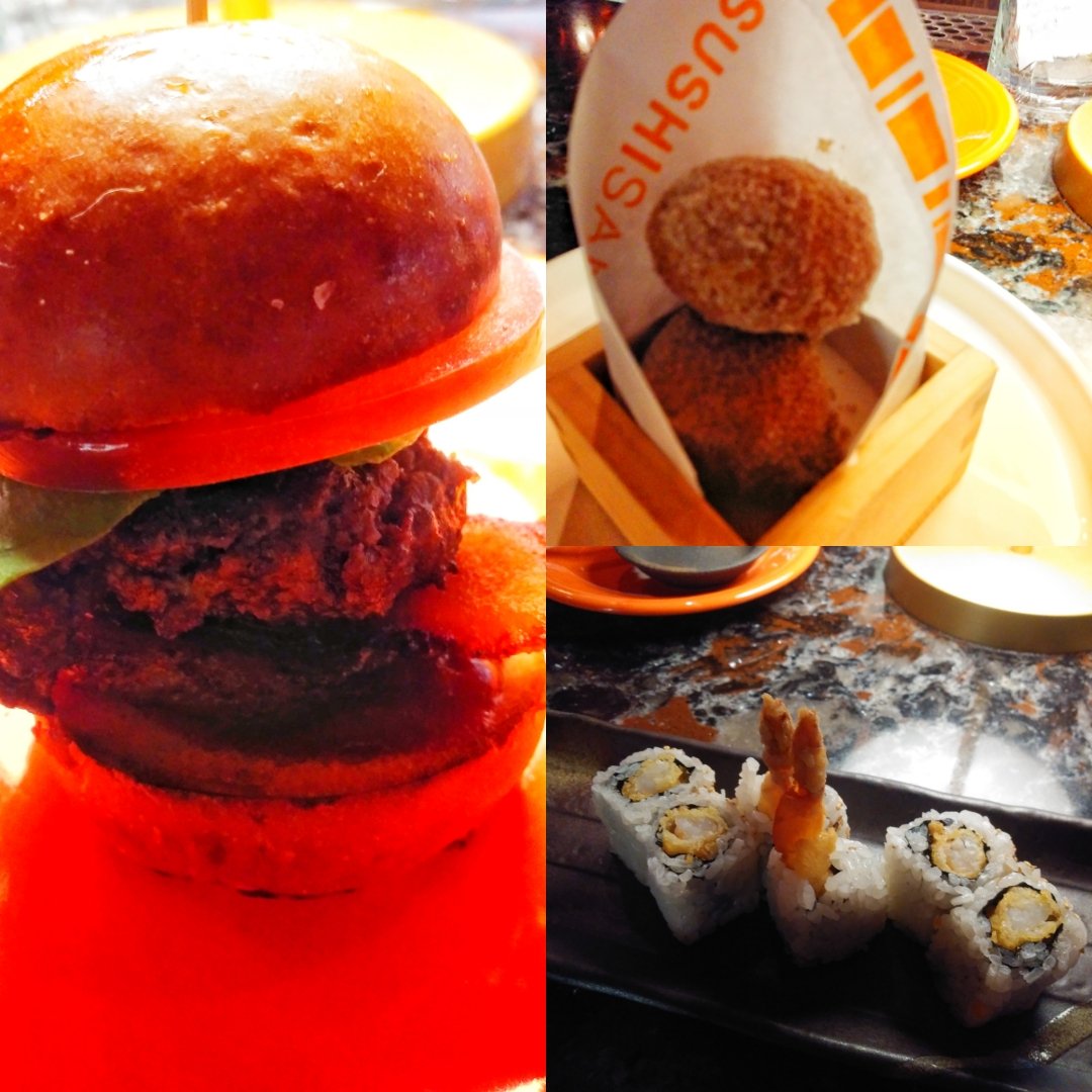 All the elements of a fantastic happy hour: Wagyu, shrimp tempura and caramel-filled donuts