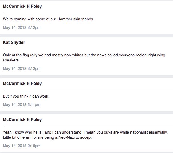 That wasn't an alt-lite chat, btw. This is literally the same chat, where "McCormick Foley," aka Vanguard America member Fred Arena, says that white nationalists aren't Nazi enough for him, and then announces that he's bringing Hammerskins. Kat Snyder doesn't bat an eye.pic.twitter.com/uFrNzFASdL