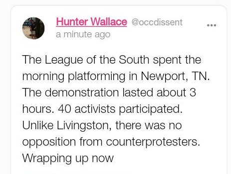TFW you get deplatformed and outorganized even in so-called "Trump Country" so you have to organize a secret rally an hour away from your original location and still try to call it a victory. LoS showed up unannounced in Newport, TN with a handful of the usual suspects today pic.twitter.com/npob11m6ii